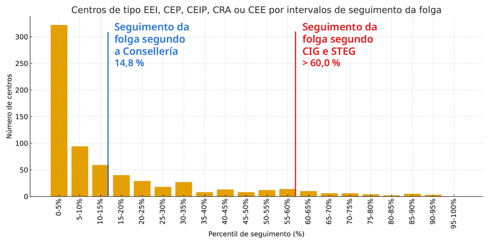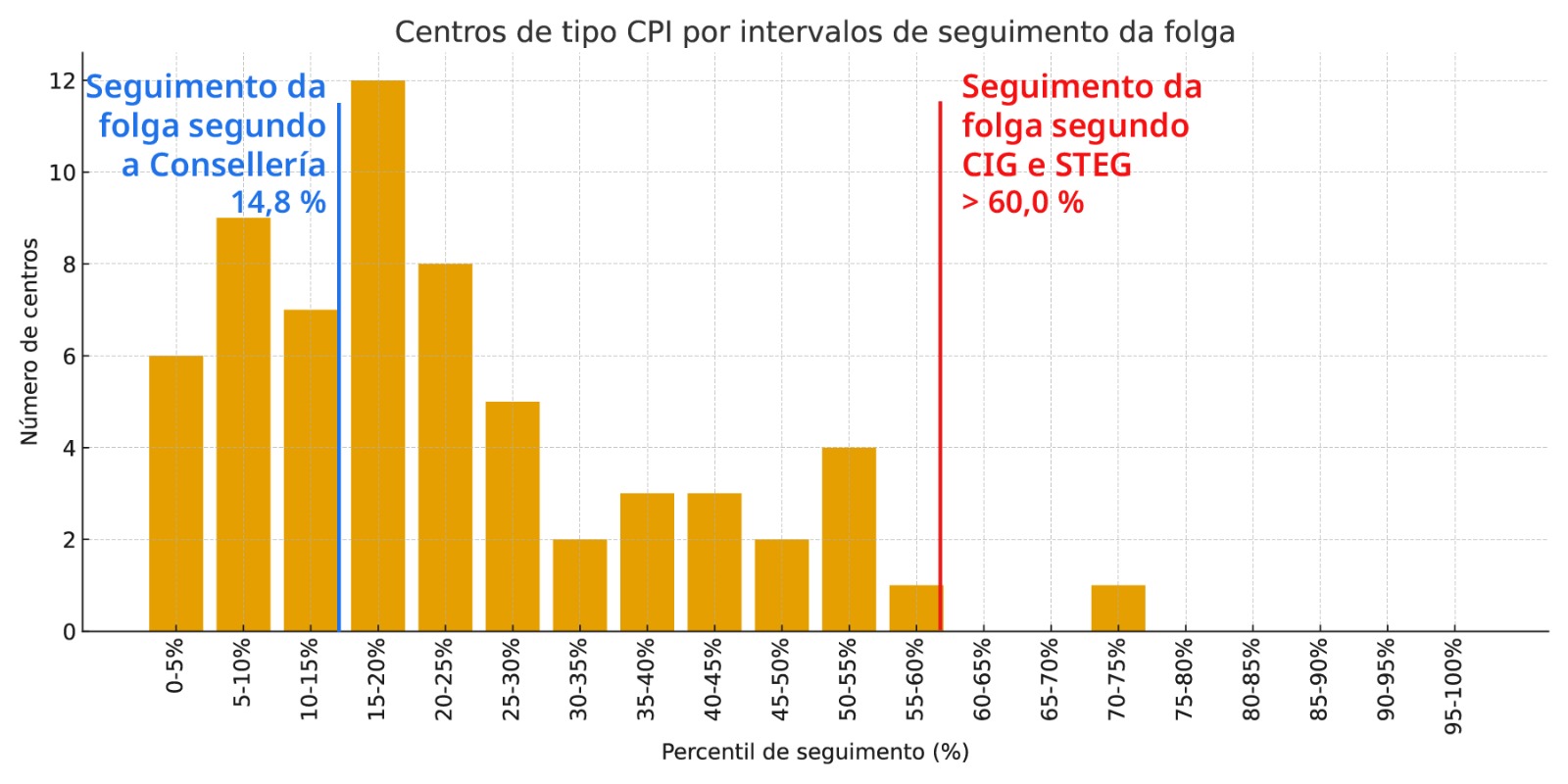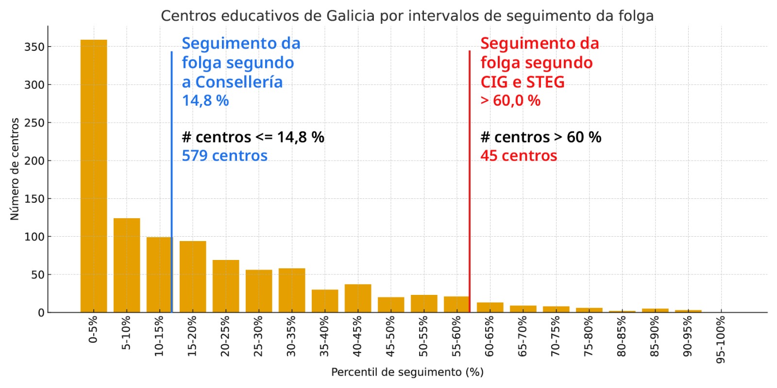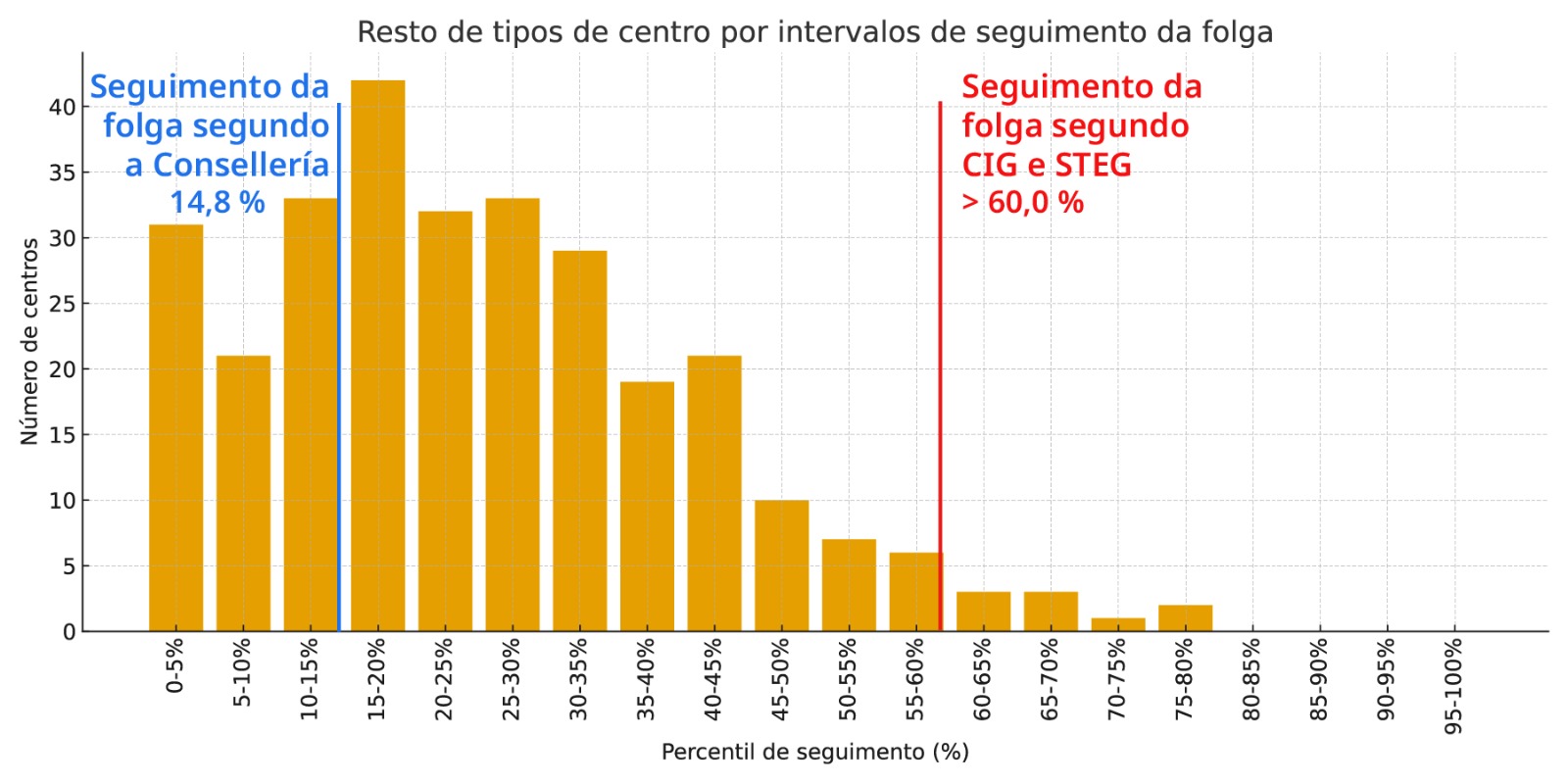 A verdade é que ese 60 % non se sostén, por moito que nos gustaría que así fose, mais esta realidade é froito dunha folga convocada sen consenso. Os datos que manexamos aproximan a participación ás cifras oficiais, sen seren tan baixas como sinala a Administración, pero moi lonxe da versión distorsionada difundida pola CIG e o STEG.