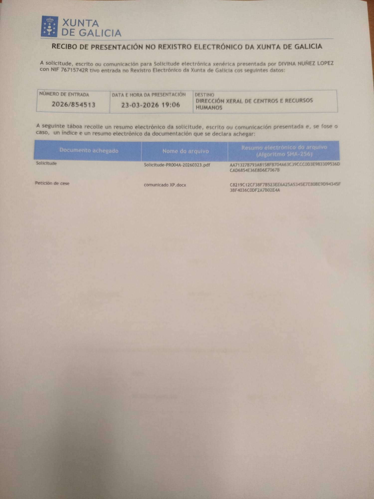 O pasado luns, 23 de marzo, esta Xunta de Persoal solicitou formalmente á Consellería de Educación o seu cesamento. A día de hoxe, non se recibiu ningunha resposta por parte da Administración.SOLICITUDE e XUSTIFICANTE